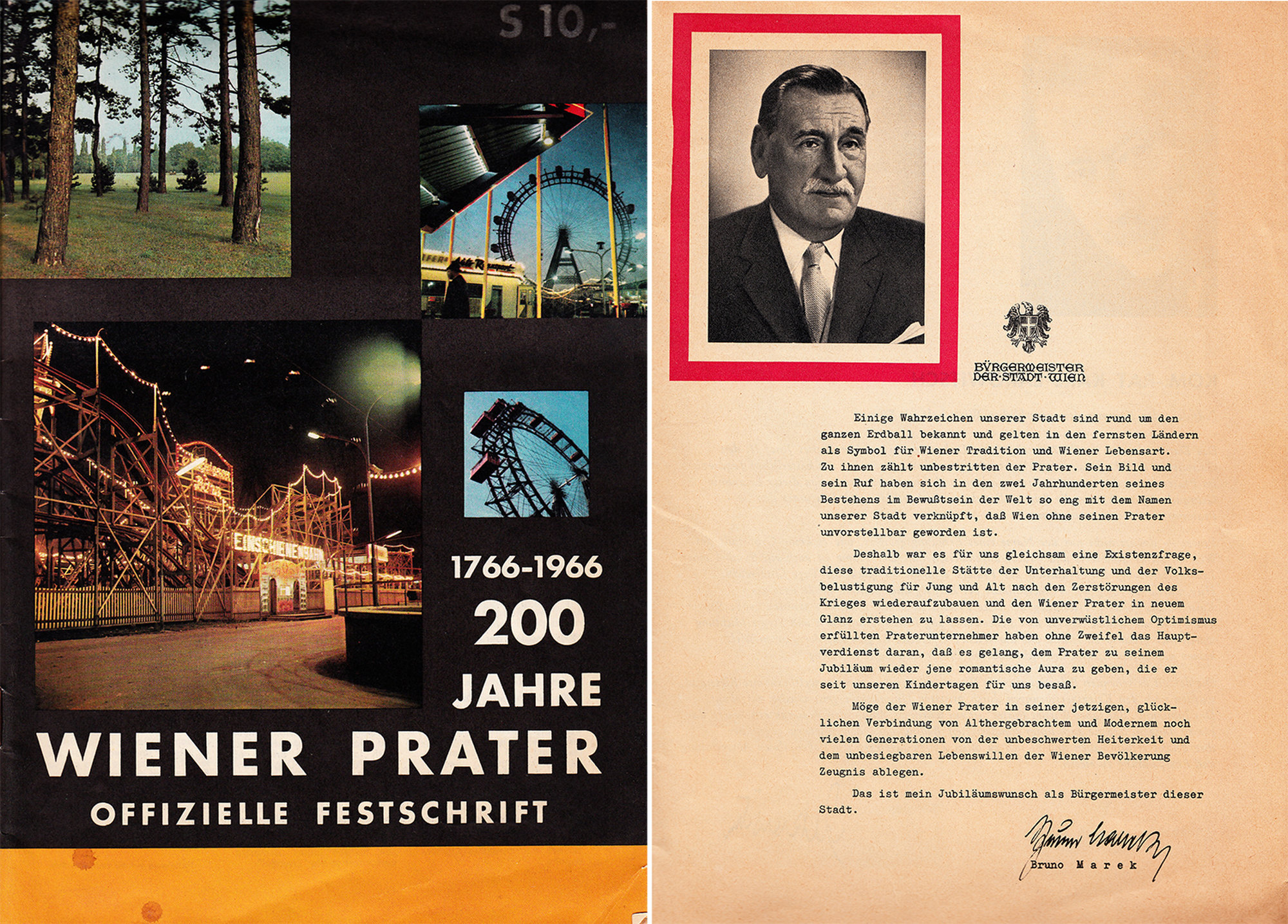 In der Broschüre „Offizielle Festschrift“ sind Berichterstattungen, Gedichte, geschichtliche Anekdoten und Bilder, Reden und Briefe zu finden. Der damalige Wiener Bürgermeister Bruno Marek lobt den großen Einsatz der Praterunternehmer beim Wiederaufbau.